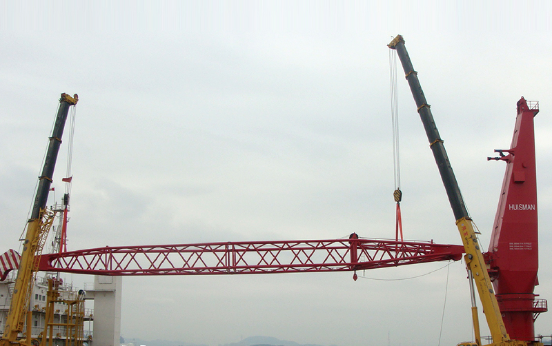 兩臺起重機(jī)在廈門港海上吊裝作業(yè)